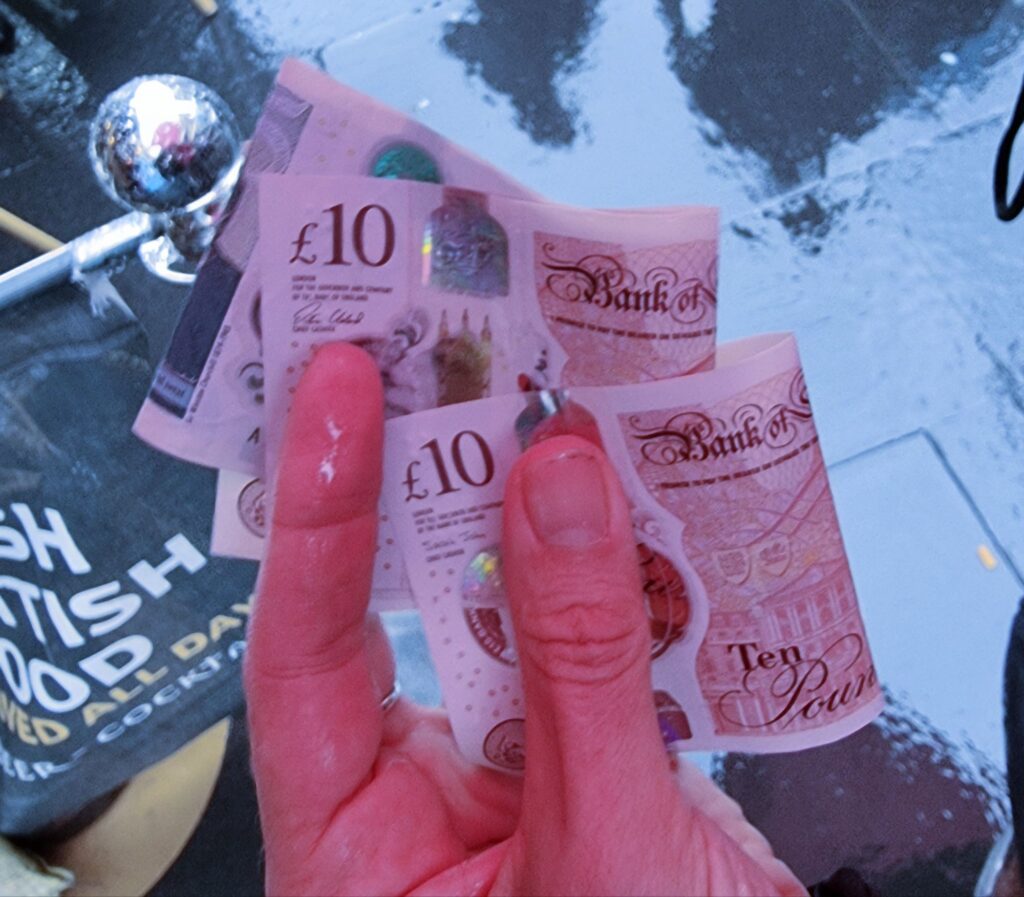 Auf dem Rückweg vom Castle hat Anja dann noch 35 £ auf der Straße gefunden. Sie lagen da einfach so, regennass. 5 £ haben wir dem nächsten Bettler geschenkt, die restlichen 30 £ lassen wir mal im Portemonnaie – just in case – wir haben nämlich keine Pfund eingetauscht und mit Euros kommt man in Brexit-Schottland nicht so weit.