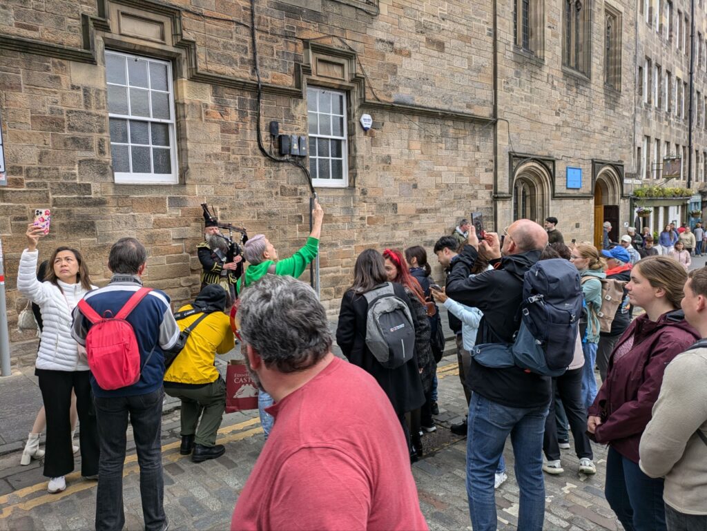 Wir sind dann weiter durch die Royal Mile hoch zum Edinburgh Castle gelaufen. Auf dem Weg dorthin haben wir einen Dudelsackspieler, viele majestätische alte Gebäude und natürlich einen riesigen Strom von Touristen gesehen.