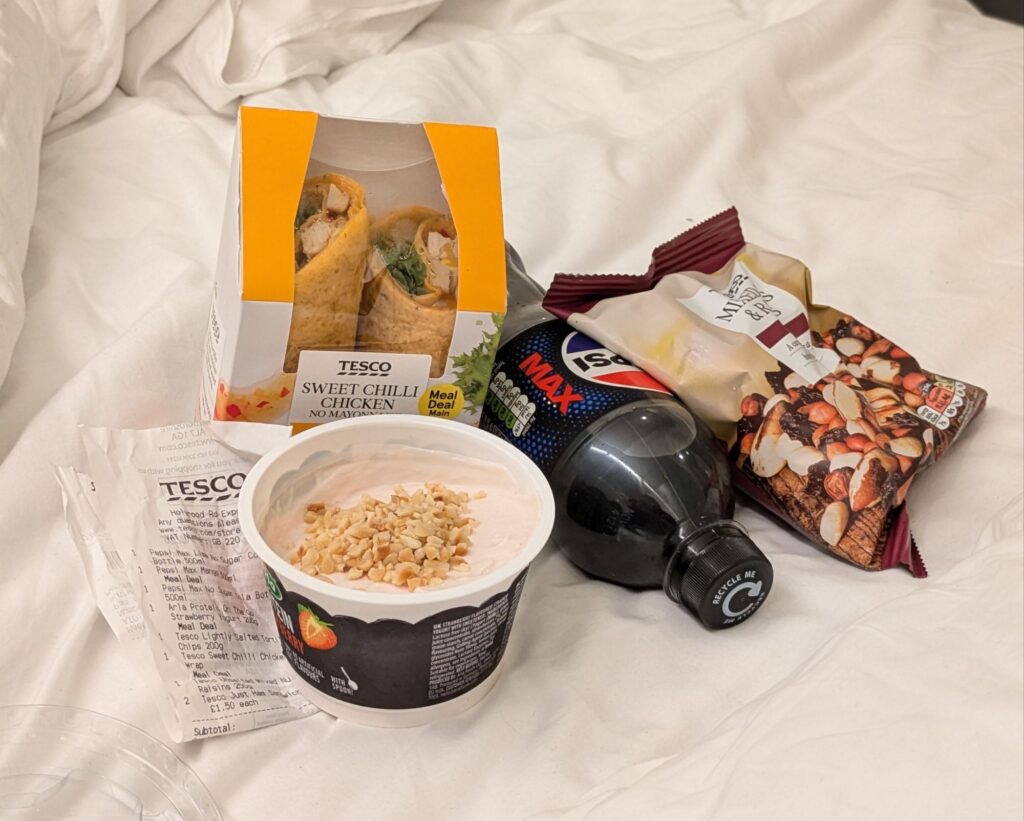 Die Jungz hatten eh keine Lust gehabt mitzukommen, da es immer noch in Strömen regnete. Kurzerhand haben wir schlussendlich beschlossen, im Tesco Store ums Eck nur schnell ein paar Snacks für das Abendessen einzukaufen.
