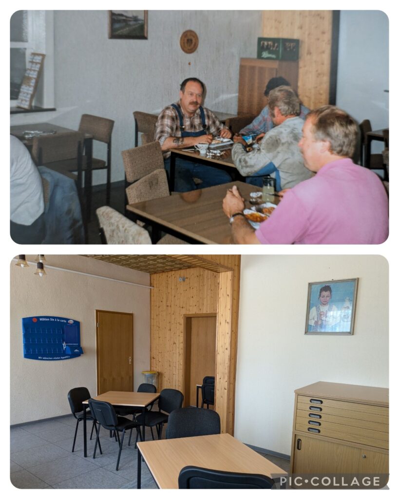 Ich musste morgens um 6 Uhr am Melkstand sein. An meinem ersten Arbeitstag wollte ich tatkräftig um 6 Uhr loslegen, da sagte Heinz zu mir, und deute auf den freien Stuhl neben sich (s. oben, wo Gabi sitzt): „Ruhig, Mädchen, setz dich erst mal hin. Es ist doch noch früh am Tage!“ Begonnen mit dem Melken haben wir dann immer erst 20 nach 6. Aber pünktlich um 6 Uhr war Dienstbeginn. ☺️