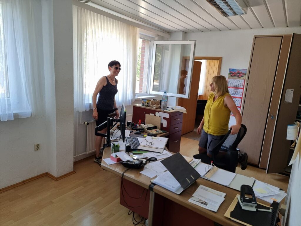 Nostalgisch-begeistert fing ich an zu filmen … Und plötzlich öffnete sich ein Fenster und ein Mann fragte, ob er uns helfen könne. Ich: „Ja!“ – und ich stellte mich vor. Neben ihm stand eine Frau, und sie sagte: „Ich erinnere mich!“ … Sie baten uns rein … Die Frau war Andrea, die damalige und heutige Bürokraft, nur zwei Jahre älter als ich. (Den Mann kannte ich nicht, er war damals noch nicht dort beschäftigt.)