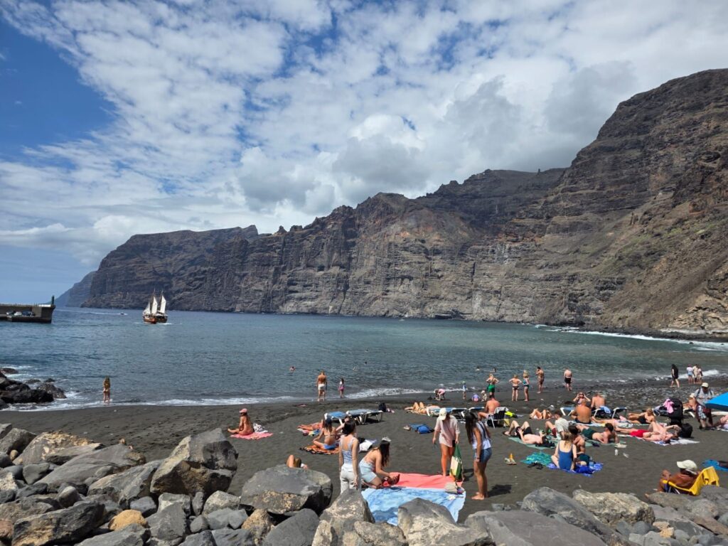 Gegen 13:00 Uhr, als wir wieder am Hafen waren, sind wir weiter nach Los Gigantes gefahren. Dort gibt es bis zu 450m hohe Klippen, die wir uns ansehen wollten. In Los Gigantes war neben dem Hafen ein kleiner Strand, den ich zum Schwimmen und Anja zum Beine abkühlen genutzt haben. Durch den starken Wind gab es dort ordentlich starke Wellen und die Kulisse mit den Klippen war ziemlich einmalig.
