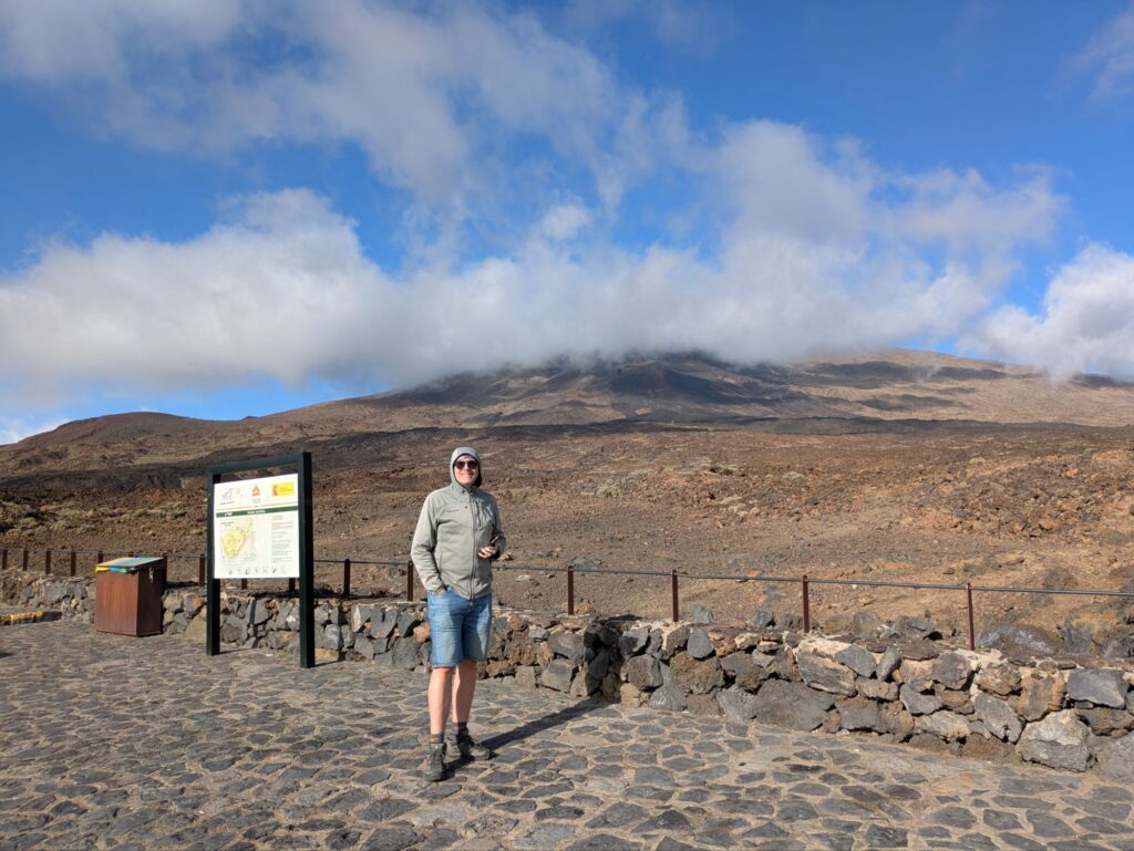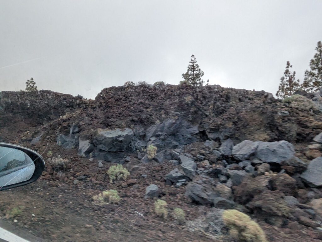 Auf dem Weg dorthin wurde es erst einmal neblig und feucht. Ich habe schon überlegt, wieder zurückzufahren, aber plötzlich waren wir auf 2000m über den Wolken bei allerbestem Sonnenschein. Nur frisch war es, im Schatten gerade noch 6°C. Da der Teide ein aktiver Vulkan ist, kam uns die Landschaft sehr Isländisch vor. Anfang noch mit viel Wald, doch so ab 1700m war dann es sehr karg.