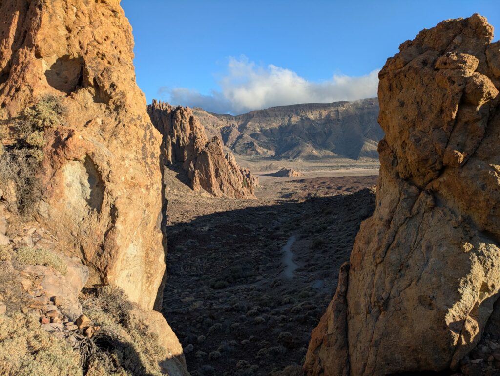 Nach einem Besuch der nächsten Eisdiele haben wir überlegt, was wir mit dem angefangenen Tag noch machen können. Ich kam auf die Idee nicht Richtung Teide zu fahren, Anja hatte eine Empfehlung für eine kleine Wanderung um ein paar sehenswerte Lavafelsen, genannt Roque Garcia herum, wovon der Roque Cinchado wegen seiner Ähnlichkeit mit dem Profil eines Gesichts eines der Wahrzeichen von Teneriffa ist.