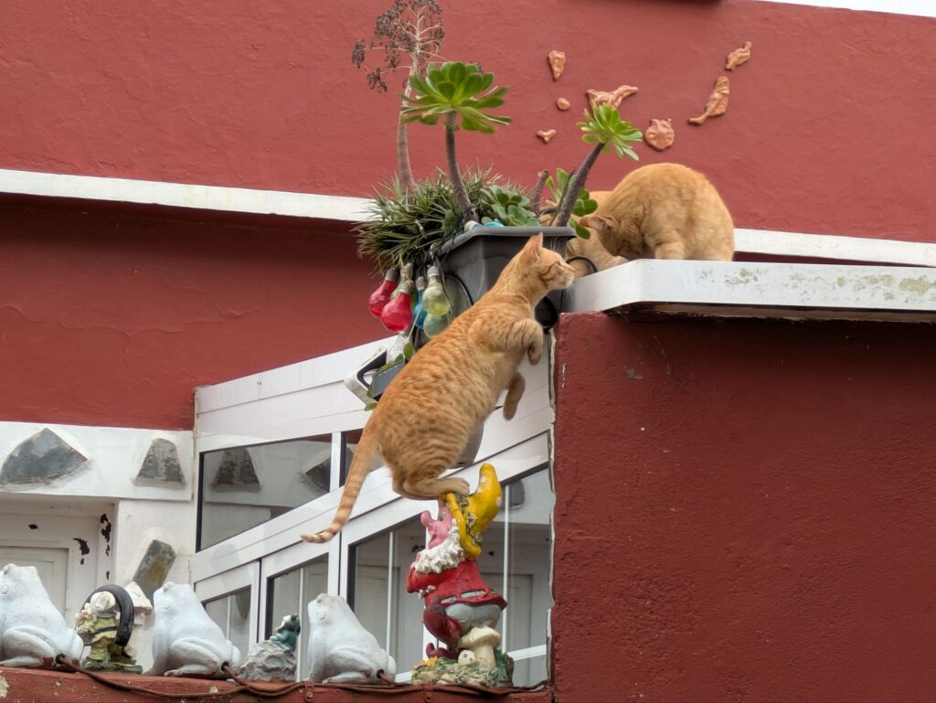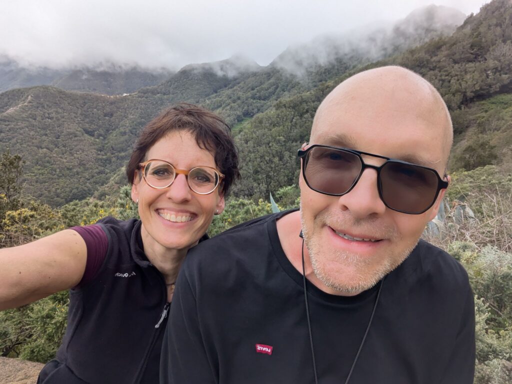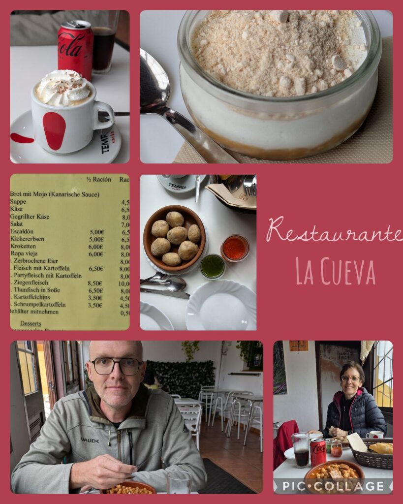 In Chinamada waren wir plötzlich von Wolken umgeben und es fing an zu regnen. Wir haben die Zeit genutzt und im örtlichen Resurante la Cueva zu Mittag gegessen. Anja hatte Papas Arrugadas, also Kartoffeln mit Dips, und ich hatte Garbanzas, ein kanarisches Kichererbsengericht mit Fleischeinlage. Beides sehr lecker. Die Bedienung war sehr auf Zack, fast zu sehr, sie ließ uns fast keine Zeit zum Karte studieren. Als Nachtisch hatten wir noch einen Polvito „Süßes Pülverchen“, zerbröselte Kekse mit zerbröseltem Karamell und oben drauf zerbröselten Baisse. Sehr ungesund also und genauso lecker.