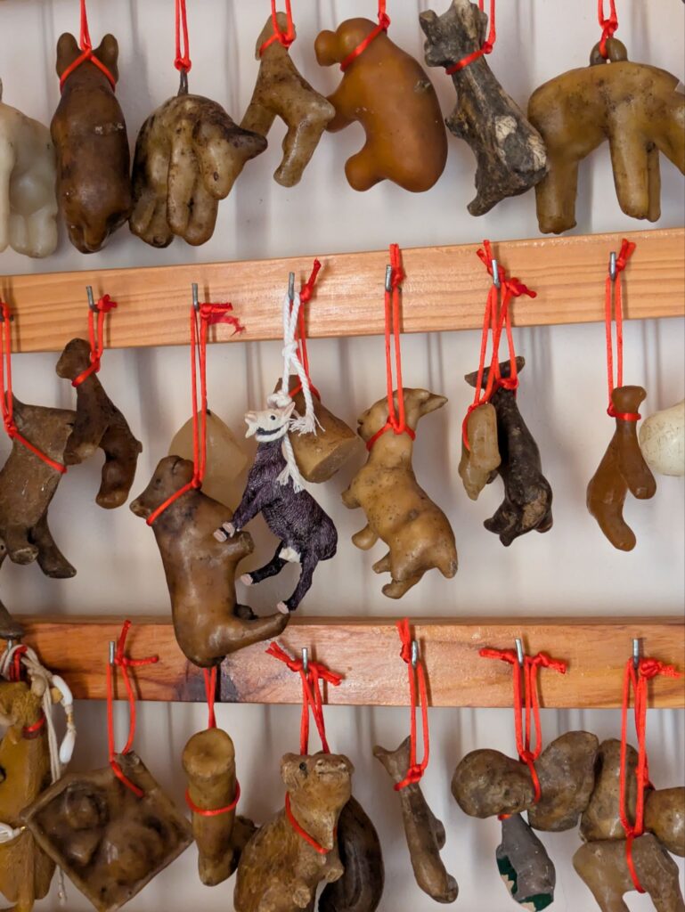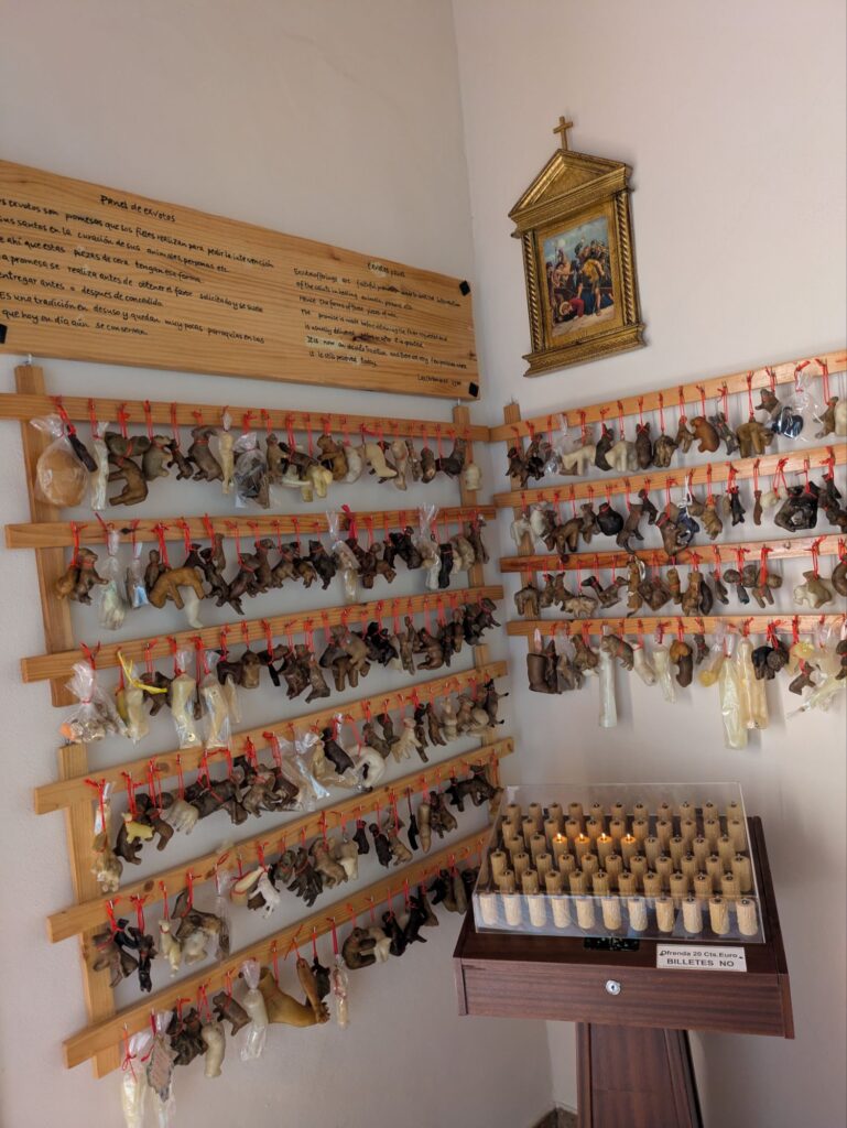 Ich habe dort im Auto eine Stunde geschlafen, während Anja sich das Dorf und die dazugehörigen Kirche angesehen hat. Hier existiert noch ein alter Brauch, wo Wachsabbildungen von Tieren und Menschen in der Kirche aufgehängt werden und man damit hofft, dass die Tiere und Menschen wieder gesund werden. Das meiste sind wohl Ziegen … 🤔 Ja, und Beine (sehen eher aus wie Gummistiefel). Da waren wahre Wachs-Künstler dabei, die um Gnade damit gebeten haben – und nicht so geschickte Leute. 😬
