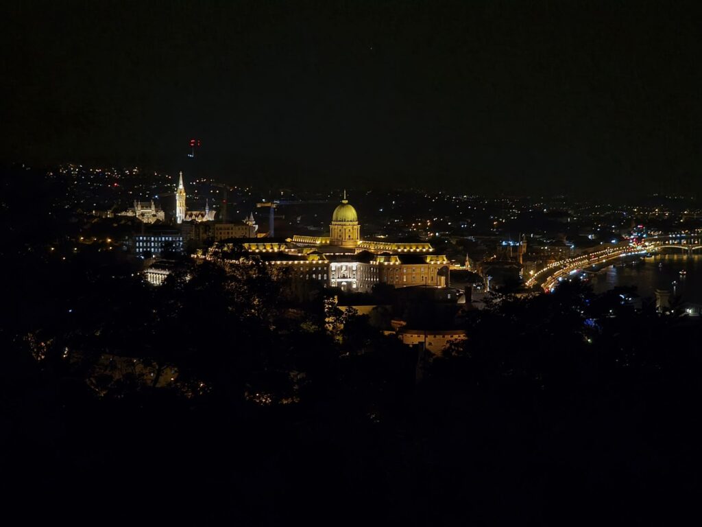 Jetzt war es schon recht spät, aber wir hatten uns noch vorgenommen, hoch auf die Budapester Zitadelle, den Gellértberg, zu wandern. Die Öffentlichen fahren leider nicht hoch. Später haben wir dann auch verstanden, warum: oben alles Baustelle! Wir haben uns beim Weg auf den gut 100 m hohen Budapester Berg schon gewundert, warum die Wegbeleuchtung abgeschaltet war. Von oben herunter kamen viele Leute mit Handy-Taschenlampe, wir haben unsere auch irgendwann eingeschaltet, weil es zu dunkel war. Nach einiger Zeit haben wir die Beleuchtung oben auf dem Berg gesehen und was war davor? Ein dicker, fetter Bauzaun. Die Zitadelle wird gerade renoviert und ist von daher komplett gesperrt. Von etwas tieferer Stelle sind uns dann trotzdem noch ein paar sehr schöne Nachtaufnahmen der Stadt gelungen, aber das war alles schon ziemlich abenteuerlich.