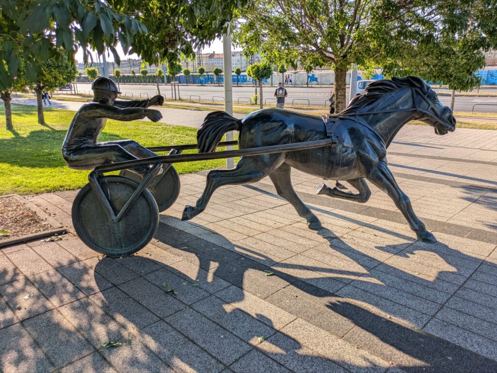 Wir wollten dann weiter zu einem Badestrand an der Donau, doch zuerst sind wir in eine Mall in der Nähe vom Bahnhof gelaufen und habe ein paar neue T-Shirts für mich gekauft. Ich hatte fast nur Langarm-Shirts eingepackt. An der Stelle der Mall hat früher wohl mal eine Pferderennbahn gestanden. Der Name „Arena“, eine Trabrennpferd-Denkmal-Statue und die alte Zuschauertribüne zeugen noch davon.