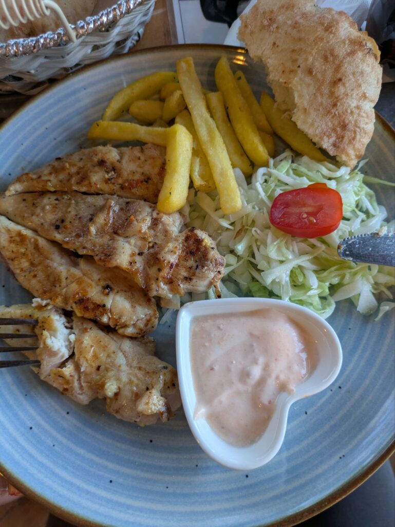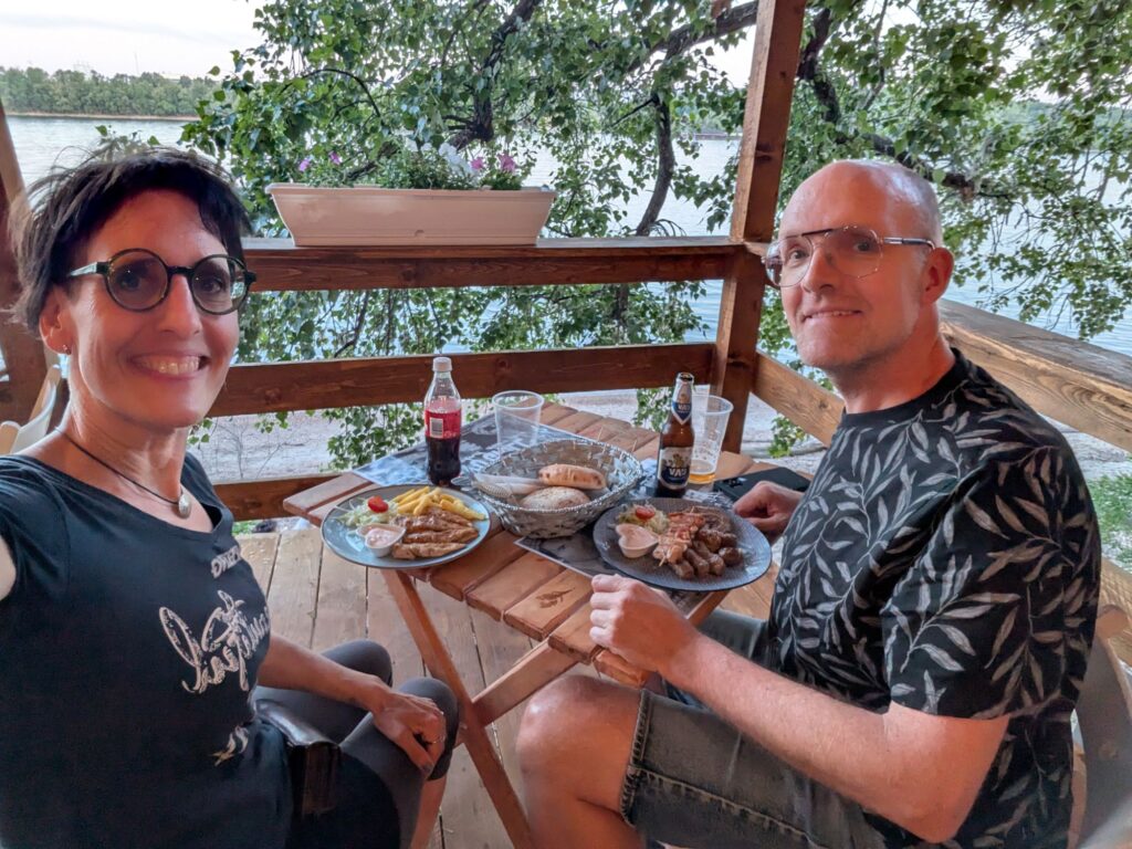 Weil wir beide Hunger hatten, sind wir dann in einer Grill-Bar gleich am Strand eingekehrt. Anja hatte gegrilltes Hähnchenbrustfilet, ich einen Grillteller mit Cevapcici, Ražnjići und einem Hacksteak. Dazu gab es Krautsalat und Zwiebeln. Passenderweise hieß der Grill Ex-Yu, also Ex-Jugoslavien. Wahrscheinlich ist der Besitzer aus dem ehemaligen Jugoslawien nach Ungarn eingewandert. War jedenfalls sehr lecker, die 4,7 Google-Sterne fanden wir sehr verdient.