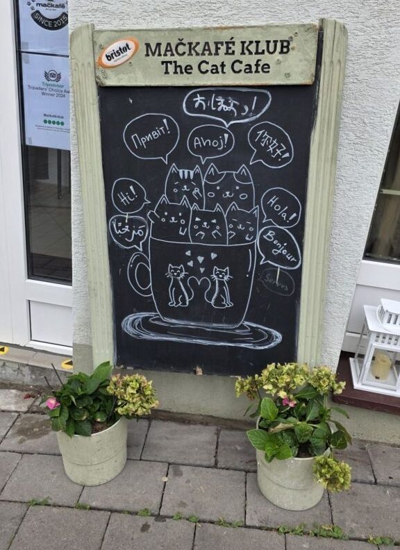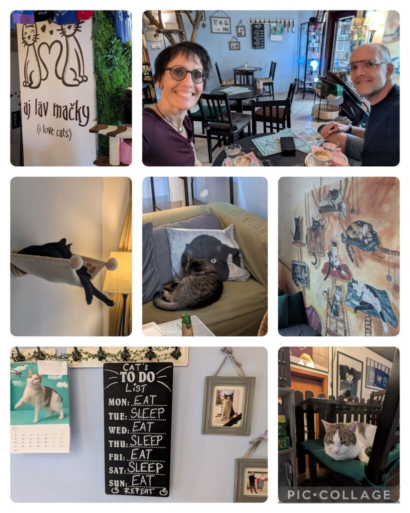 Auf dem Rückweg von der Burg in die Altstadt sind wir zufällig an dem Katzen-Café „Mačkafé“ vorbeigekommen. Dort mussten wir natürlich einkehren. Wir hatten jeweils einen Cappuccino und haben uns einen Käsekuchen geteilt [Anja: Ich hatte 1 Gabel! Der Kuchen war aber auch eher winzig. 😉).