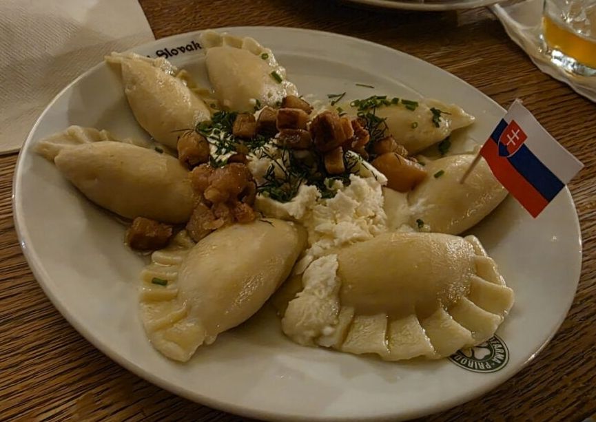 Anja wählte Camembert mit Salat und ich eine Art slowakische Ravioli, gefüllt mit Schafskäse, Speck und dazu gab es Sauerrahm. Als Vorspeise haben wir uns eine leckere Knoblauch-Käse-Suppe im Brot geteilt. Dazu gab es gutes selbstgebrautes slowakisches Bier.