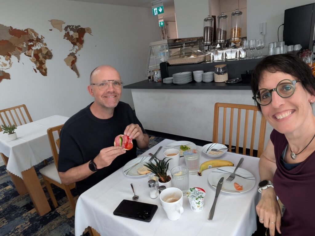 Am Abend zuvor hatte uns die Dame an der Rezeption gesagt, dass es keine erhitzten Nahrungsmittel beim Frühstück gibt, weil ihnen dazu die Lizenz in den Räumlichkeiten fehle. Wir mussten uns also innerlich vom leckeren Rührei der letzten Tage verabschieden und insbesondere Anja hatte Angst, ob sie überhaupt ausreichend satt werden würde. Die Angst vor dem Frühstück stellt sich dann aber als unbegründet heraus.