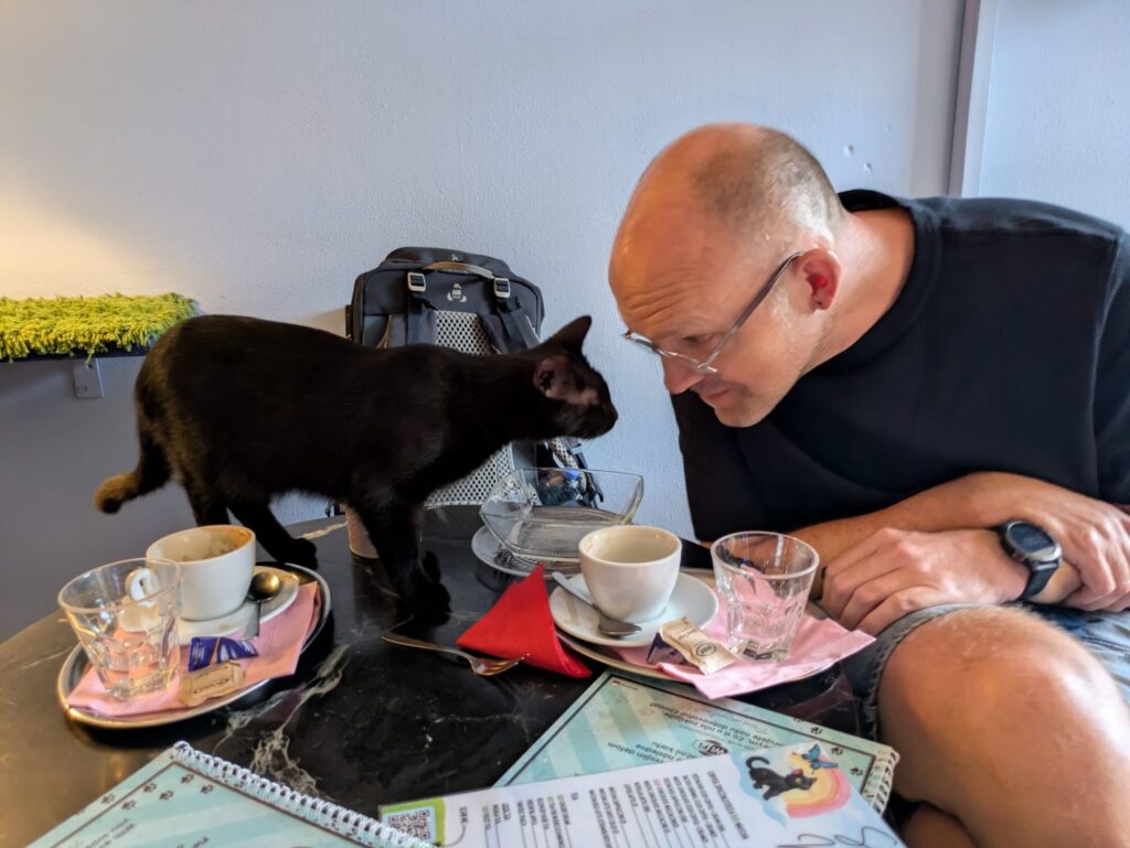 Katzen gab es dort viele, die meisten lagen aber irgendwo und haben geschlafen. Nur eine kleine schwarze Katze schlich immer wieder um uns herum, aber anstatt sich streicheln zu lassen, war sie aber nur auf der Suche nach Resten unseres Käsekuchens. Der Kuchen war aber sehr lecker und schnell verspeist – und da hatte sie dann schlechte Karten.