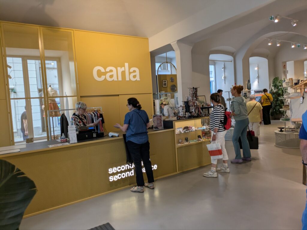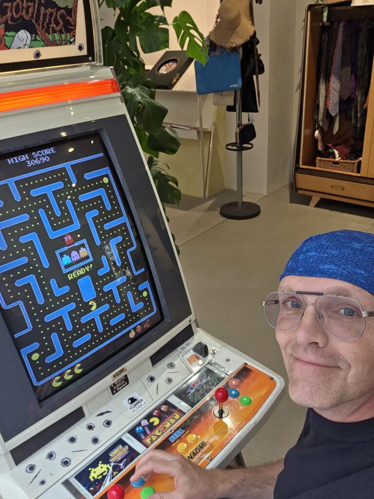 Nach dem Riesenrad-Besuch sind wir noch in die Innenstadt gegangen. Anja wollte Baumstrietzel essen, die wir in Budapest gerade so verpasst hatten. Der Laden schloss in dem Moment, als wir ihn gerade erreicht hatten. Zufällig sind wir an einem Carla-2nd-Hand-Laden (= soziales Kaufhaus) vorbeigekommen und haben dort noch zwei Hemden für unsere Jungz gekauft – also Anja hat sie gekauft. Ich habe mich derweil an einem alten Spielautomaten vergnügt und bin bei MS PacMan bis zum vierten Level gekommen.