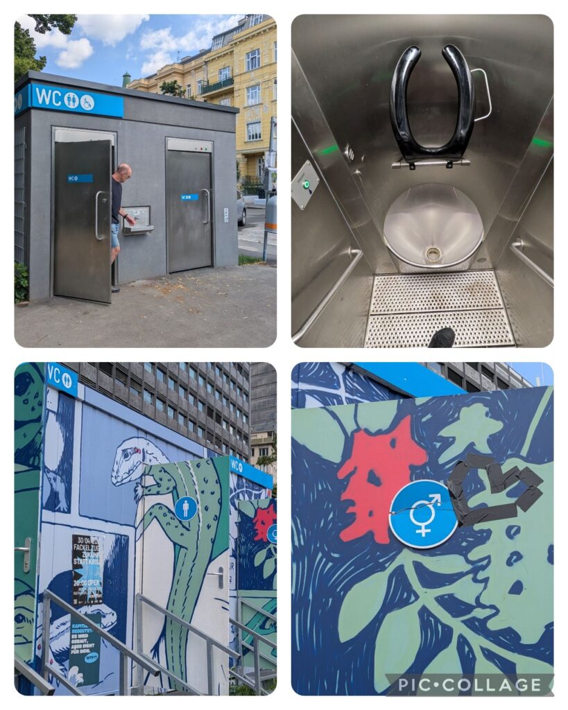 Der Ruf Wiens war aber stärker und so haben wir „Wien Prater“ ins Navi eingegeben. Dort wollten wir uns dann eine Ladestation suchen. In Wien angekommen, musste Anja erst einmal ums Eck. Zufällig hielten wir bei der Parkplatzsuche gerade direkt neben einem Toilettencontainer. Anja ist dort rein und war begeistert: Eine total neue und mega hygienische Toilette mit optional herabklappbaren Sitz. Das Waschbecken war draußen, dann kann es auch von vorbeilaufenden Leuten zum Wasserflaschen nachfüllen benutzt werden und sie werden weniger verschmutzt. Da die Toilette so spaßig war, habe ich sie auch gleich ausprobiert. Unten: das zweite Klo des Tages entlang des Graffiti-gesäumten Weges, entlang der Wien.