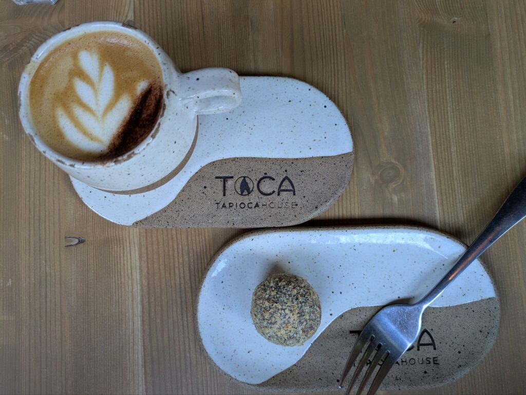 Als Anja und ich in der Innenstadt angelangt sind, fängt es plötzlich an zu regnen. Wir retten uns in ein nettes Café mit Cappucino, Muffins für mich und einer runden Avokado-Schoko-Kugel für Anja.