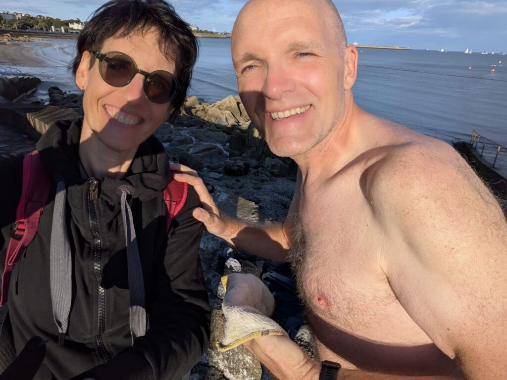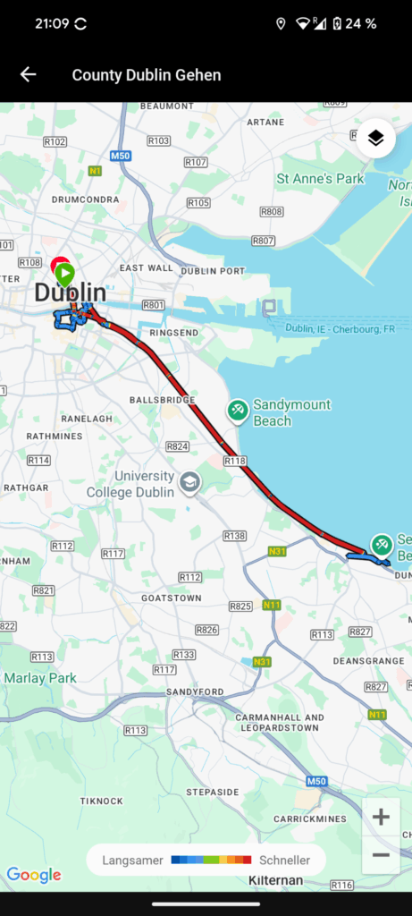 Zum Tagesausklang, es hat wieder aufgehört zu regnen, wollen wir noch ans Meer. Ich habe die leise Hoffnung, noch eine Runde schwimmen zu können. Die DART (Dublin Area Rapid Transport), eine Art Dubliner S-Bahn, bringt uns zum Seapoint Beach, wo wir dann nicht alleine sind.