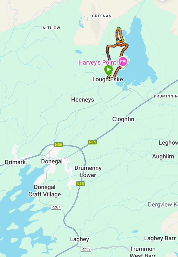 Da wir wissen, dass zu langes Herumlungen zu Rammdößigkeit führt, wollen wir es doch einmal mit der frischen Luft probieren. Anja und ich brechen in einer Regenpause auf zum Lough Eske, etwa 10 km nördlich von Donegal. Dort habe ich eine kleine Runde herausgesucht.
