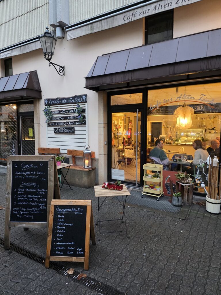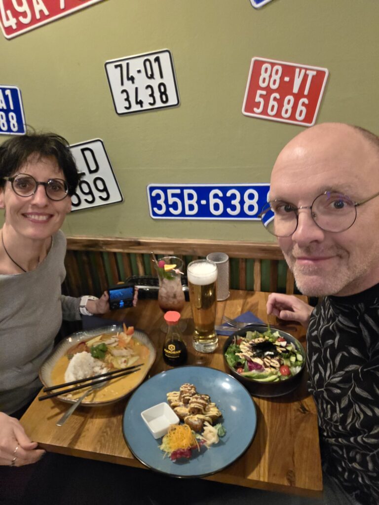 Jetzt ist es dunkel und gegen 17:30 Uhr; wir beschließen, unser Abendessen um eine Stunde vorzuziehen und sind gegen 18:30 Uhr in der Nähe vom Boxhagener Platz im Restaurant „Tat“. Anja hatte das über ChatGPT gefunden und wir wurden nicht enttäuscht (4,9 Sterne bei mehreren Hundert Bewertungen). Sehr leckeres Essen und Trinken, wir lassen es richtig krachen und gönnen uns Vor-, doppelte Haupt- und Nachspeise für gar nicht mal so viel Geld. Hier müssen wir unbedingt mal wieder hin, wenn es uns nach Berlin verschlägt.