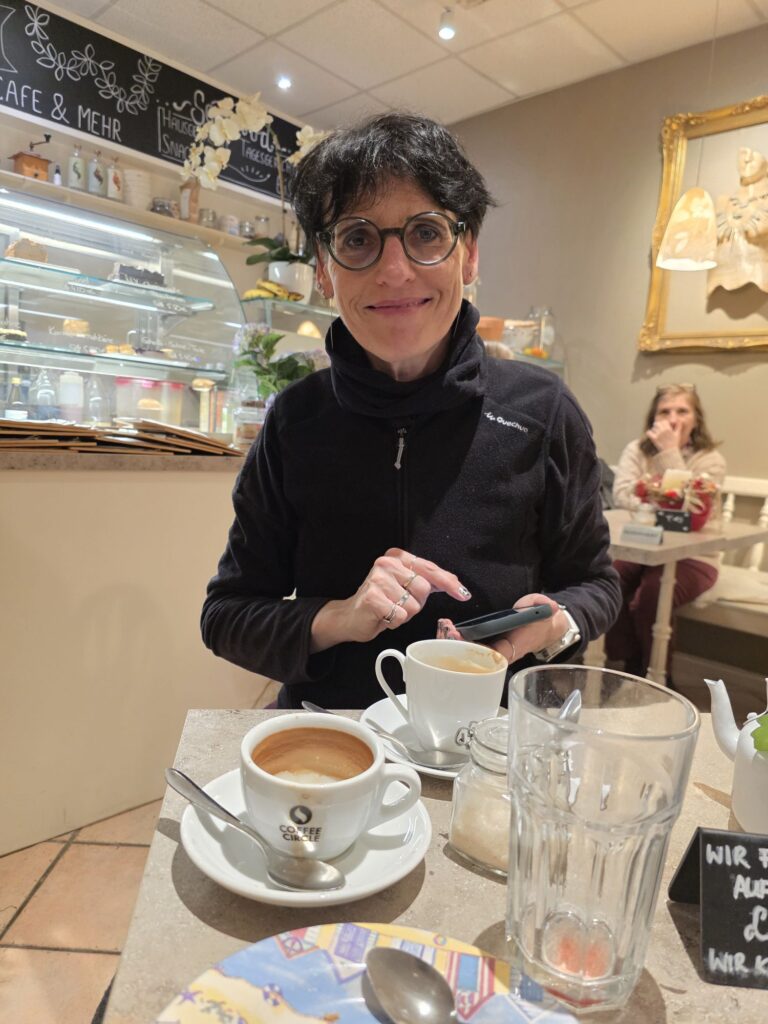 Frühstück gab es heute selbstgemacht im Hotelzimmer. Anja hat sich am Abend vorher Müsli mit Joghurt gemixt („Overnight Oats“), ich hatte Müsli und einen Pack Milch im Rewe gekauft. Lecker und vor allem nicht zu viel. Dazu gab es Instant-Kaffee, dank Wasserkocher und etwas Geschirr im Zimmer. (Die Hotel-Pension hier bietet kein Frühstück an.)