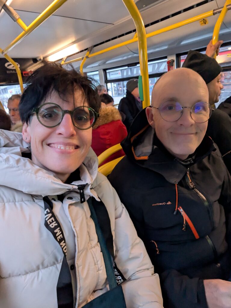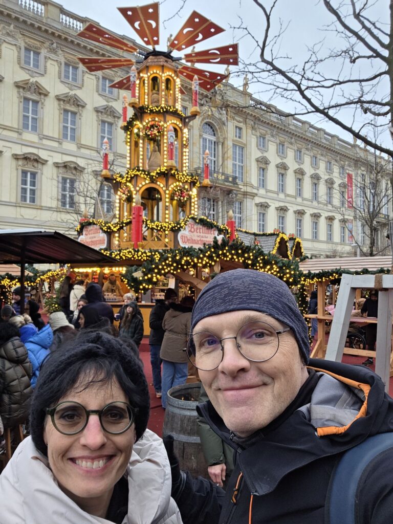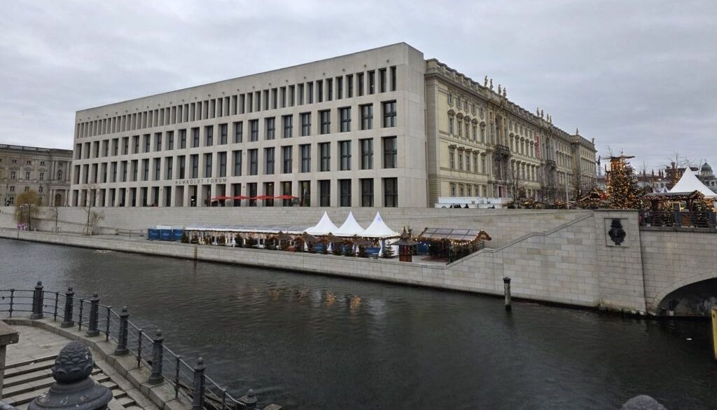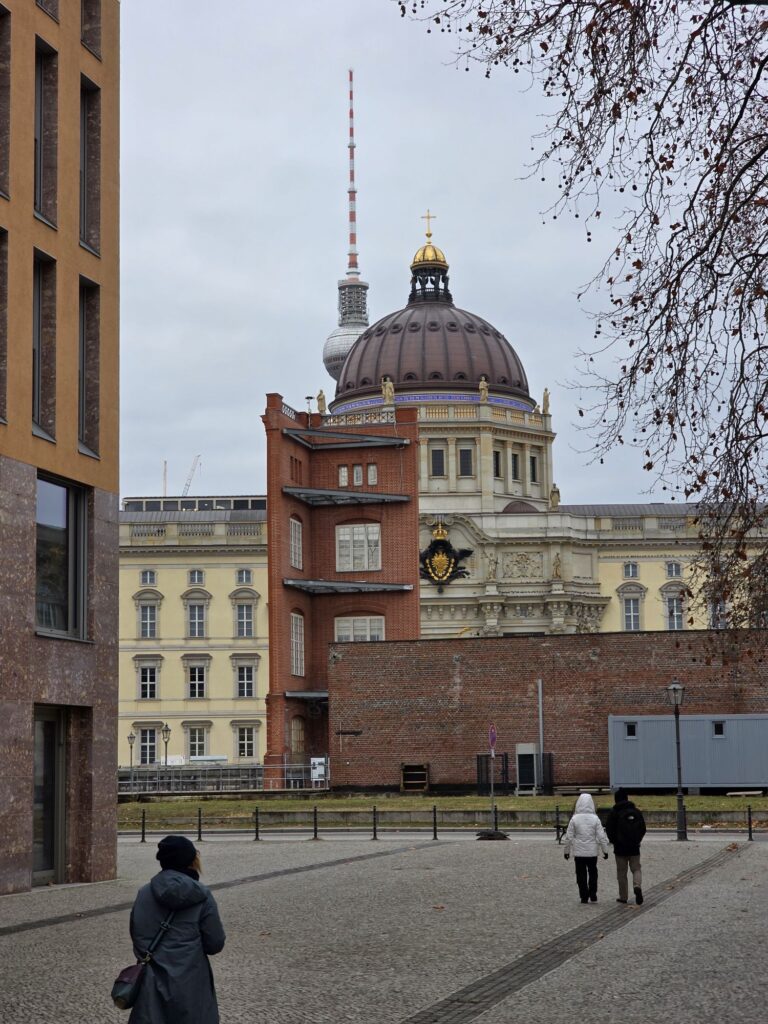 Vom Dom liefen wir weiter zum Humboldt-Forum, dem erst kürzlich wieder aufgebauten Stadtschloss auf dem Gelände des früheren Palasts der Republik („Erichs Lampenladen“) aus DDR-Zeiten. Dort gab es einen kleinen Weihnachtsmarkt, wo wir ein paar Quarkbällchen snackten und zwei Glühwein tranken. Wir liefen dann weiter zum Alexanderplatz und weil es windig, kalt und regnerisch war, setzten wir uns in den 200er-Bus und fuhren durch die Stadt zum Bahnhof-Zoo. Die Linie 100 und 200 fahren eine ähnliche Strecke, wie die meisten Sightseeing-Busse, aber zu deutlich besseren Tarifen (wir hatten eh BVG-Tageskarten).