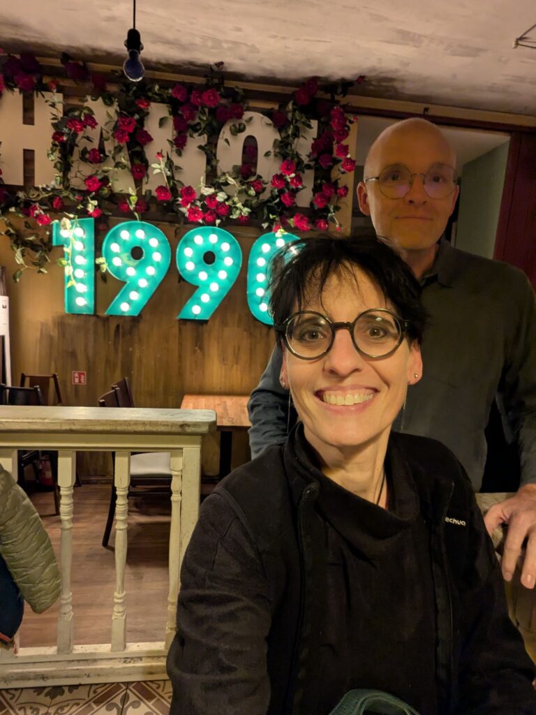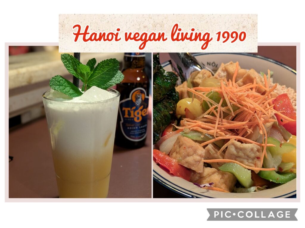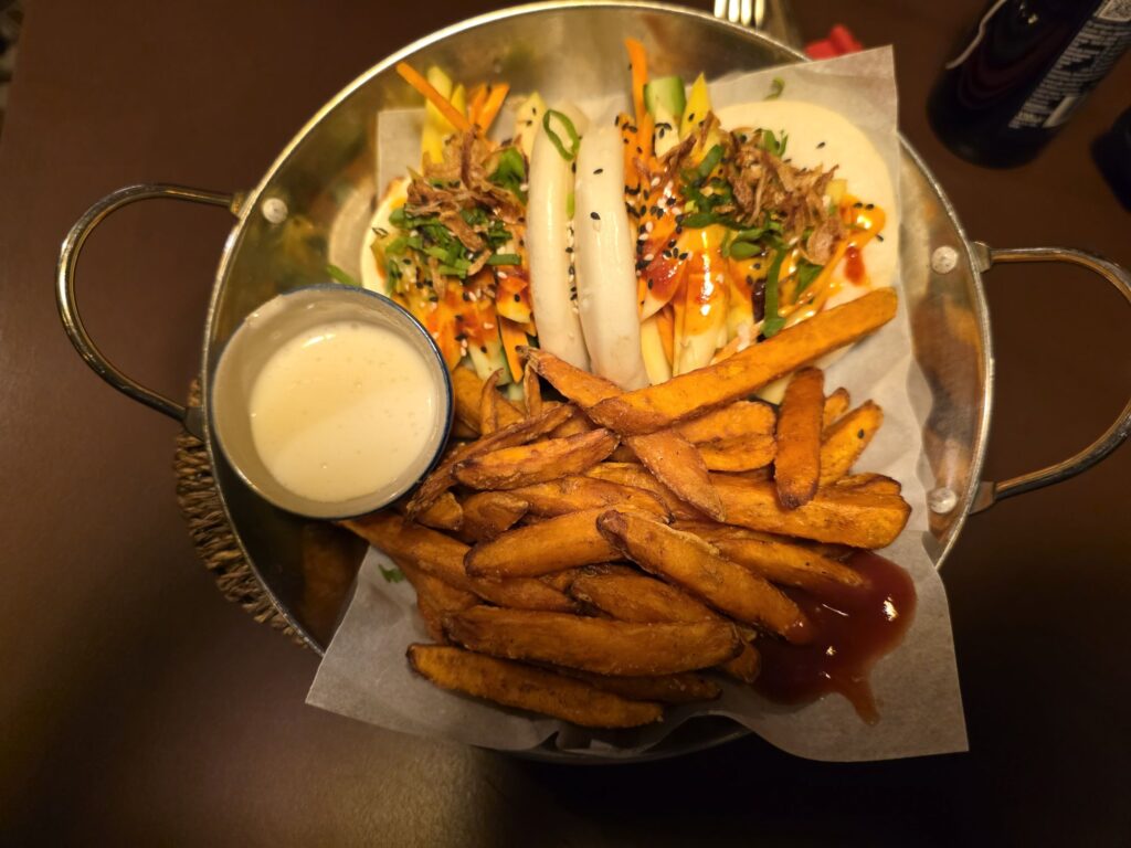 Als Abschluss für heute hatten wir uns gestern schon das Restaurant „Vegan Living 1990“ am Boxhagener Platz ausgesucht. (Danke für den tollen Tipp, Janine!). Das Essen war dann auch, wie eigentlich erwartet, sehr lecker und durchaus etwas ausgefallen. Man fällt ja selten rein, seit man alles ergoogeln kann. Anja hatte eine große Bowl mit Tofu und allerlei Gemüse, ich hatte eine sehr interessante Variation eines Burgers mit Süßkartoffel-Pommes.
