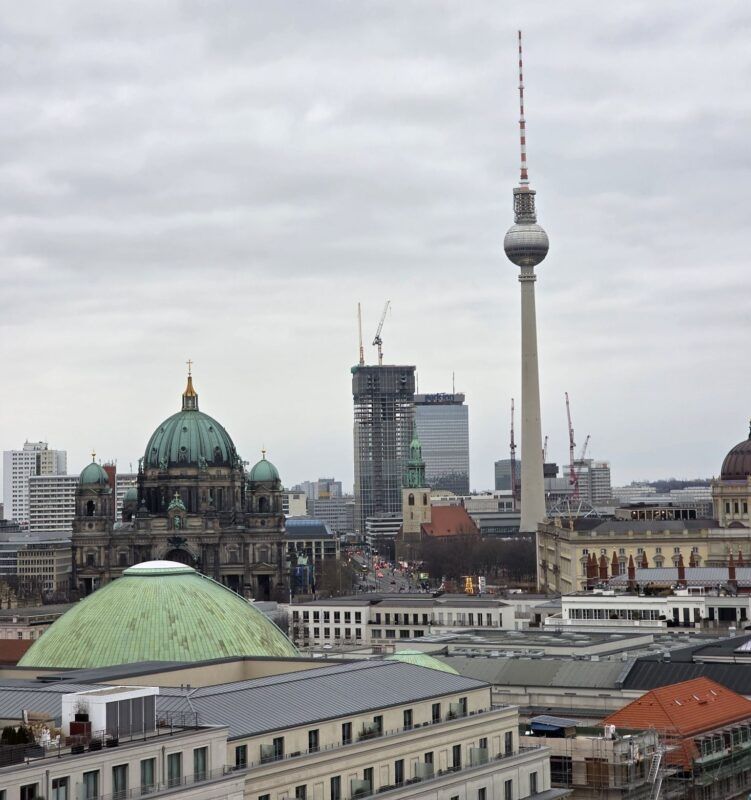 Mit der S-Bahn, der Weg zum Bahnhof ist ein guter Kilometer zu Fuß, ging es dann in die Stadt. Unser erstes Ziel war der französische Dom. Der Dom, der gar keine Kirche ist (Dom = frz. Kuppel), brannte im 2. Weltkrieg komplett aus und wurde in den 1980ern von der ehemaligen DDR-Regierung wieder aufgebaut. Außen klassisch und innen modern. Die Plattform auf etwa 40 Metern Höhe bietet einen tollen Ausblick über die bekanntesten Berliner Sehenswürdigkeiten.